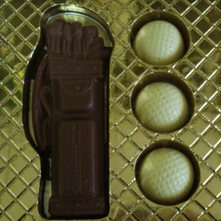 A Milk Chocolate Golf Bag with 3 white chocolate golf balls.