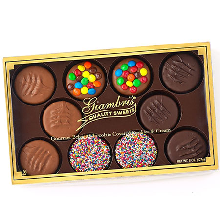 A gift box filled with 10 of our Belgian milk and dark chocolate covered Oreos, finished off with rainbow nonpareils and M&M's!